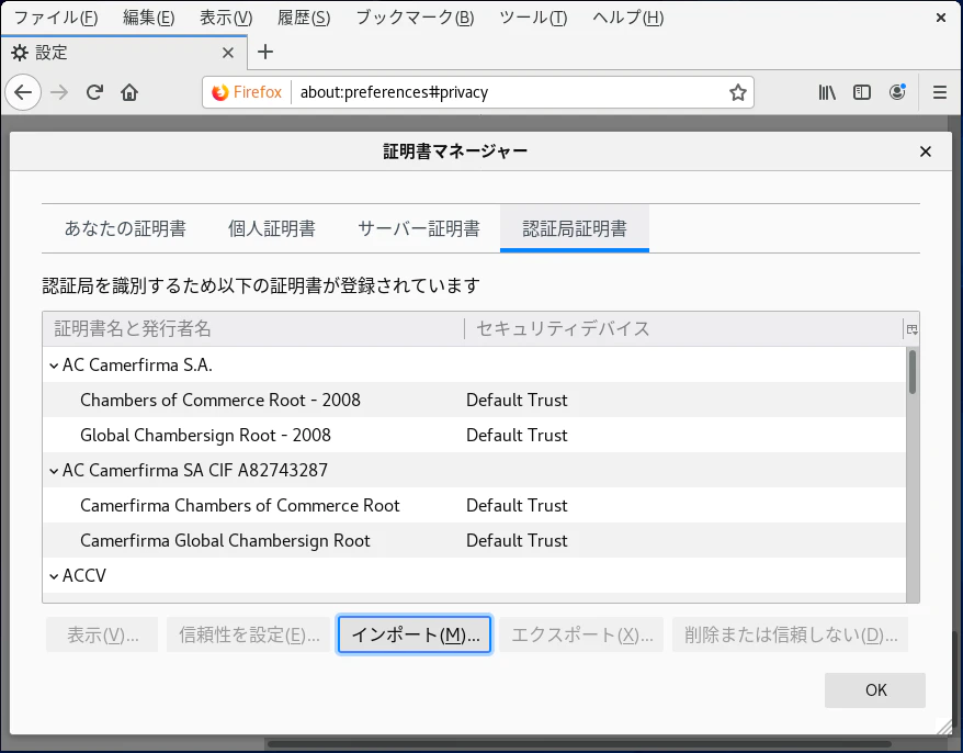 FirefoxにRoot CA証明書のインポート